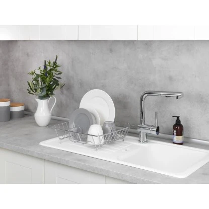 Der Geschirrabtropfkorb von Wenko aus verchromtem Metall erweitert einfach und dabei platzsparend die Spülbeckenablage um Stellmöglichkeiten für Teller, Tassen und Gläser.