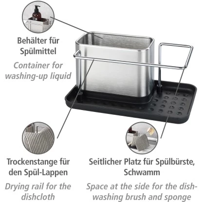Design trifft Funktionalität mit dem praktischen WENKO Spülorganizer Orio aus Edelstahl. Der stilvolle Waschbecken-Caddy ist der ideale Platz zur dekorativen Aufbewahrung und Trocknung von Spülmittel, Schwamm, Spültuch und Spülbürste. Das Maß des anwendungsorientierten Spülorganizers beträgt (B x H x T): 13,5 cm x 10 cm x 7 cm, die Gesamtabmessung liegt bei (B x H x T): 21 cm x 10,5 cm x 12 cm. Durch die übersichtliche Aufteilung des Utensilienhalters erleichtern wir Ihnen das lästige Spülen.